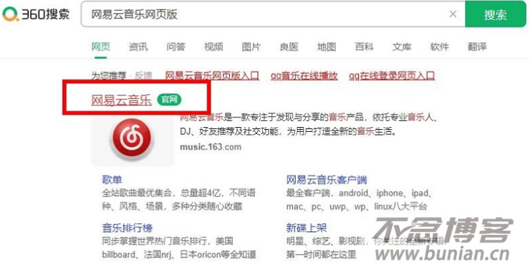 1、打开浏览器在输入框中输入“网易云音乐网页版”进行搜索,第一个带有官网的就是,打开它。
