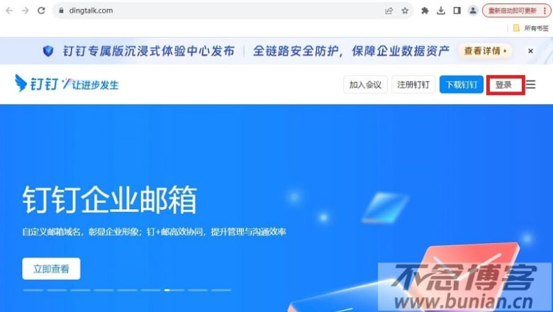 通过浏览器访问以上的官方网址就来到了钉钉网页版,在首页右上角有个登录按钮,点击它即可进行登陆。