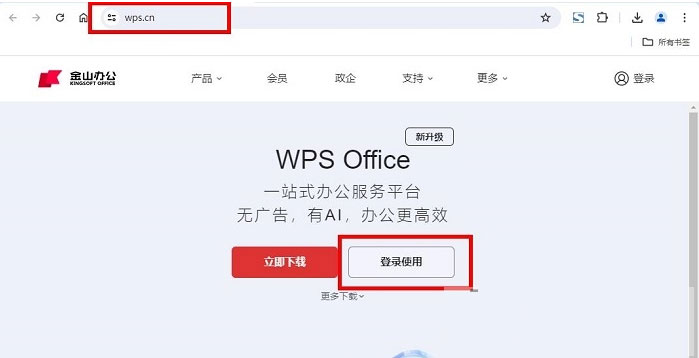 首先,打开浏览器访问WPS官方网址,进入后点击首页的“登录使用”按钮。