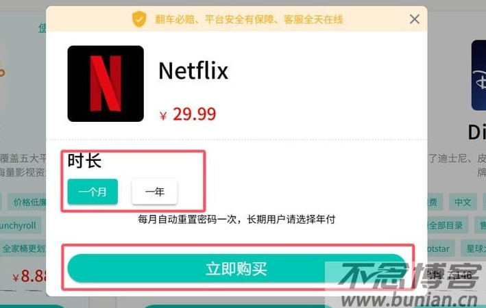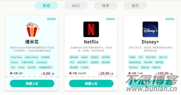 3、在回到首页,我们选择需要合租的账号类型,这里用Netflix来做案列,点击奈飞账号下面的“购票上车”。