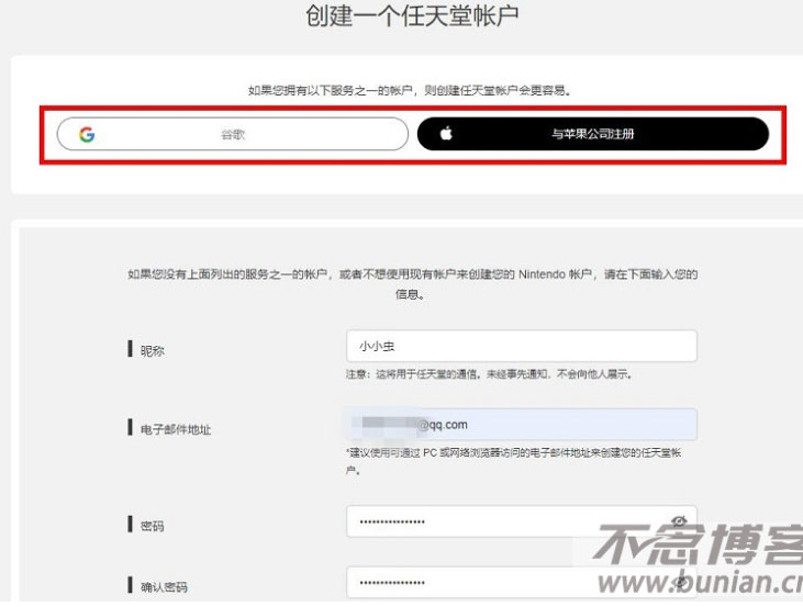 第三步:现在就来到信息填写页面,按照提示完成信息填写,如果你有谷歌账号或是苹果id可以进行注册绑定。