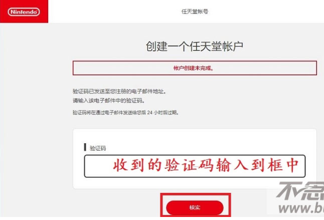 第四步:现在任天堂官方会给你所填写的邮箱发送验证码,登录你的邮箱查看,然后输入到下方框中,点击“核实”按钮。