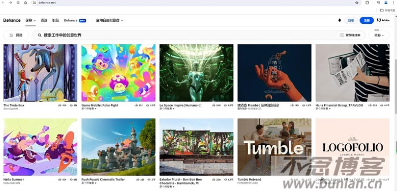 以上就是behance网页版入口,当很多用户打开时会发现,为什么无法访问呢?那是由于地区的限制,导致我们国内的用户无法直接访问使用,需要大家借助上网工具才可以访问,进入官网我们就可以看到各种创意作品。