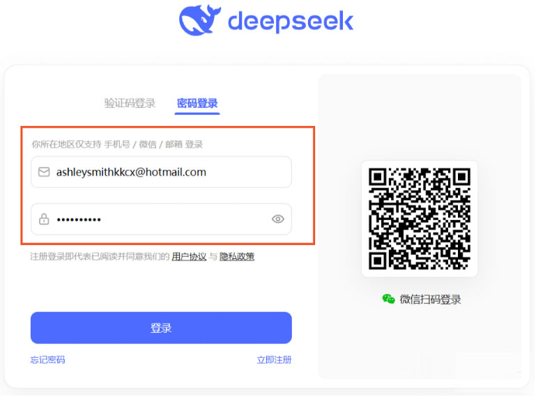 DeepSeek账号注册成功以后,我们就可以使用邮箱注册的DeepSeek账号,来通过密码登录入口进行登录了。