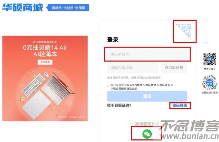 3、现在就来到了华硕商城登陆页面,官方提供了多种登陆方式,使用其中的一种方式登陆即可。