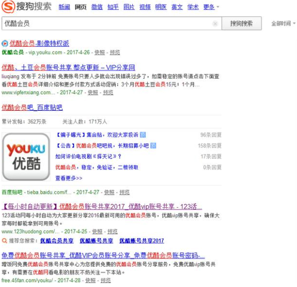 接着去网络上采集相关的会员账号和密码。这样的资源有不少,在搜索引擎上输入关键词, 就会跳转出许多免费网站。在这里,小猫拿优酷会员举例,搜索如下图。