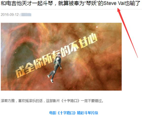 再看内容,发现是一部电影。在电影中需要这么一个情节,一个小孩子战胜了吉他大师,而且这个大师的琴弦还断了。小孩子不会弹琴,他的吉他声是后期Steve Vai做出来的。所以这个标题相当出色,能够吸睛,让人们点开内容。而且又不至于让人讨厌,不是很夸张。就这么一个标题,不知道为他的公众号提供了多少流量。