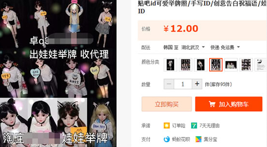 小编顺着这个思路在淘宝上面有搜了一下关键字“举牌”,发现除了非洲小朋友的举牌之外,还有各种各样的举牌,比如说自己的宠物举牌、自己的玩具娃娃举牌......