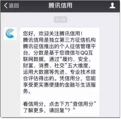 1、腾讯信用分目前只针对广东地区的用户开放申请,如果本身是广东地区的,那么直接微信关注“腾讯微信”这个公众号,点击查信用分,填写相关信息就可以直接开通了。