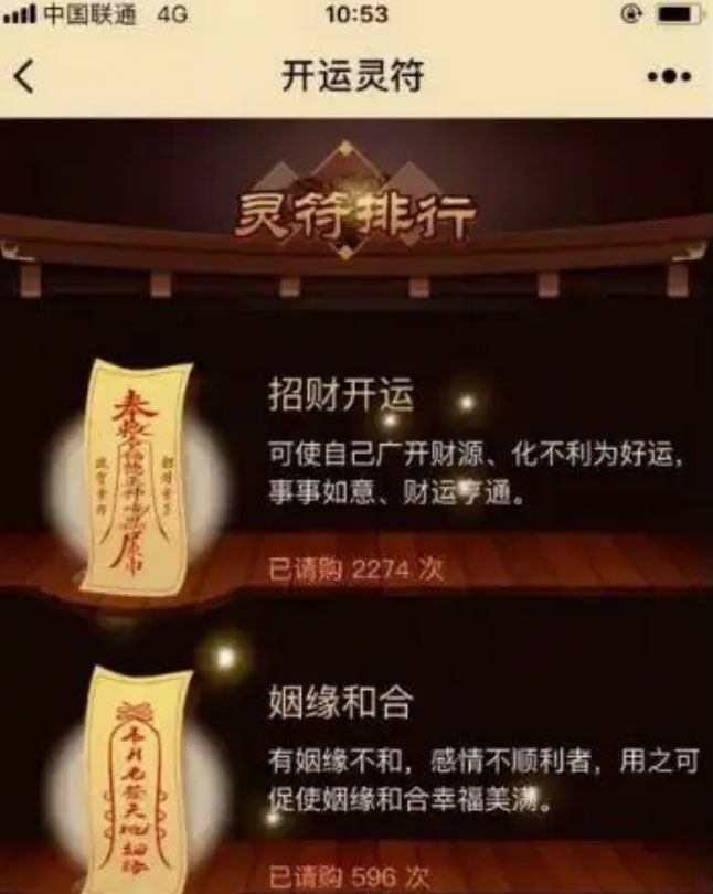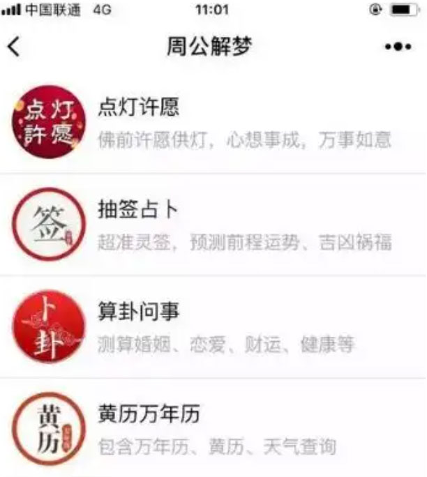 如上图所示,点灯许愿,抽签占卜,算卦问事,黄历万年历,开运灵符。基本满足你对算命的基本需求,当然基本都收费。具体收费怎么样销量怎么样,感兴趣的可以去搜索看一下。其中玩的最溜的是许愿灯。
