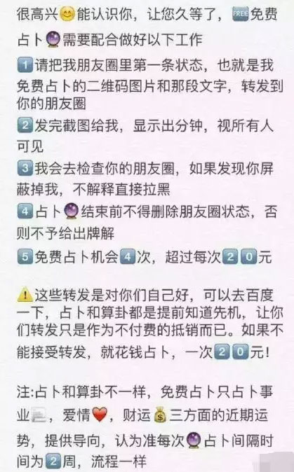 其实很简单,很多人应该都在朋友圈看过,就是让前来的用户把自己提前准备好的话术和宣传图发到自己的朋友,限制时间或者是积赞的方式,挖掘客户朋友圈的资源,然后免费赠送一次占卜服务。